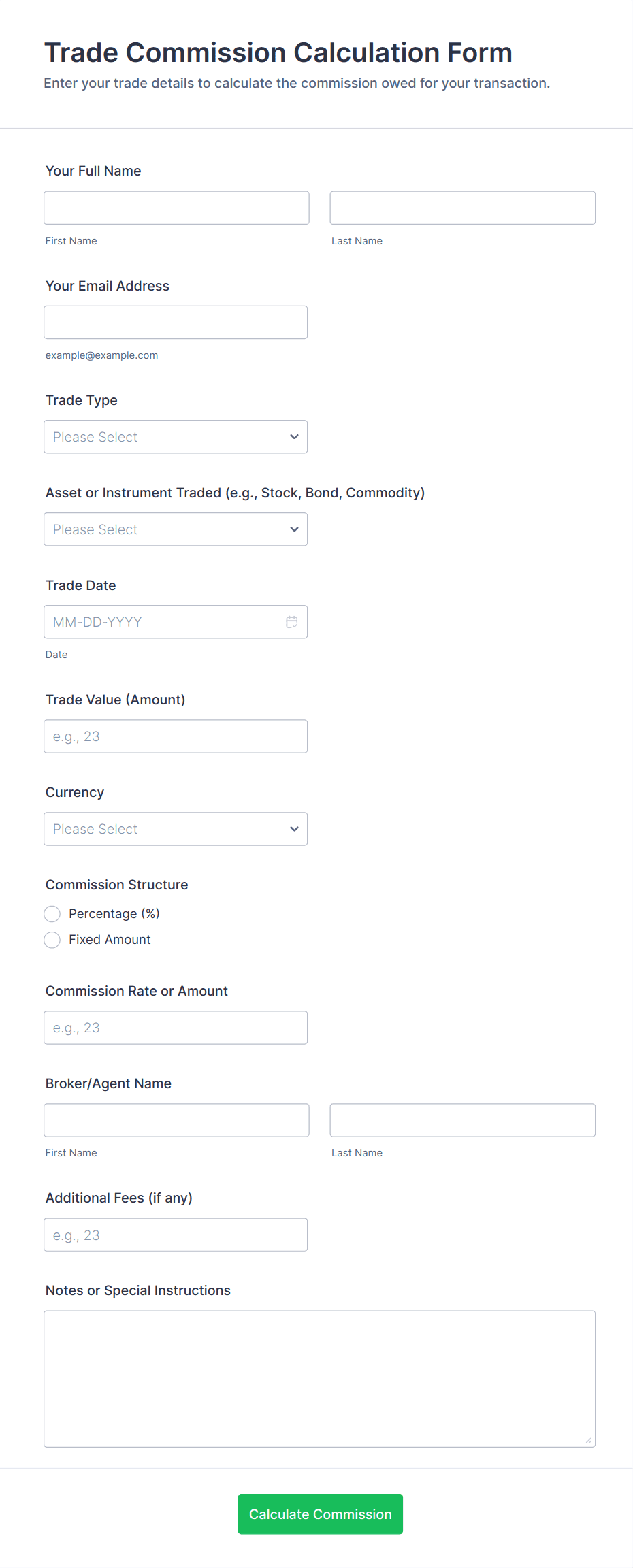 Calculation forms are specialized online forms designed to perform automatic calculations based on user input. These forms are commonly used to estimate costs, calculate totals, generate quotes, assess scores, or process any data that requires real-time mathematical operations. Typical use cases include order forms that tally product prices, loan calculators that estimate monthly payments, grade calculators for students, BMI calculators for health assessments, and budget planners for personal or business finance. Calculation forms streamline complex processes by providing instant results, reducing manual errors, and enhancing user experience.