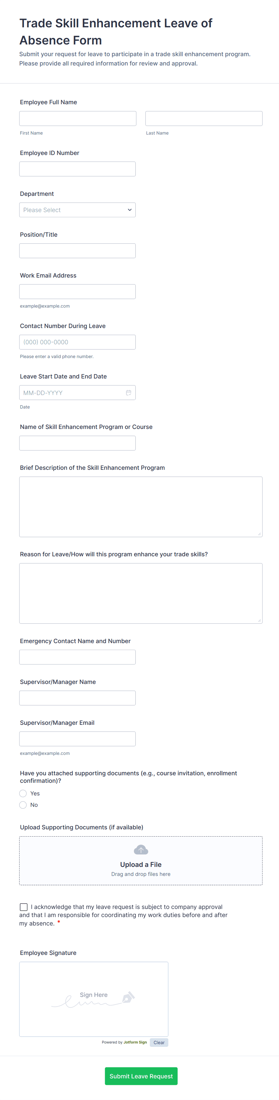 The template allows getting instant leave requests from employees with all relevant information that is needed. You can add more customized fields with Jotform.