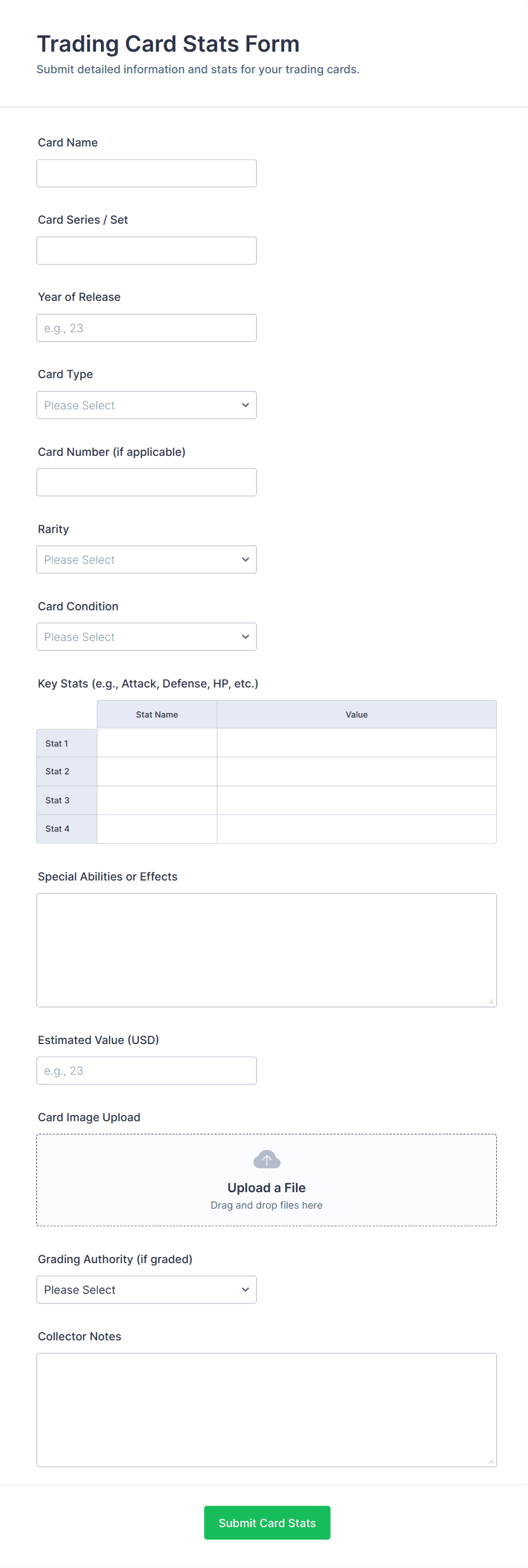 File Upload Forms are specialized online forms designed to collect files, documents, images, or other digital assets directly from users. These forms are commonly used in scenarios where individuals or organizations need to gather supporting materials, such as job applications with resumes, event registrations with ID proofs, homework submissions, design requests, or client onboarding documents. The versatility of File Upload Forms makes them essential for businesses, educational institutions, creative agencies, HR departments, and service providers who require a secure and efficient way to receive files from clients, students, or collaborators.