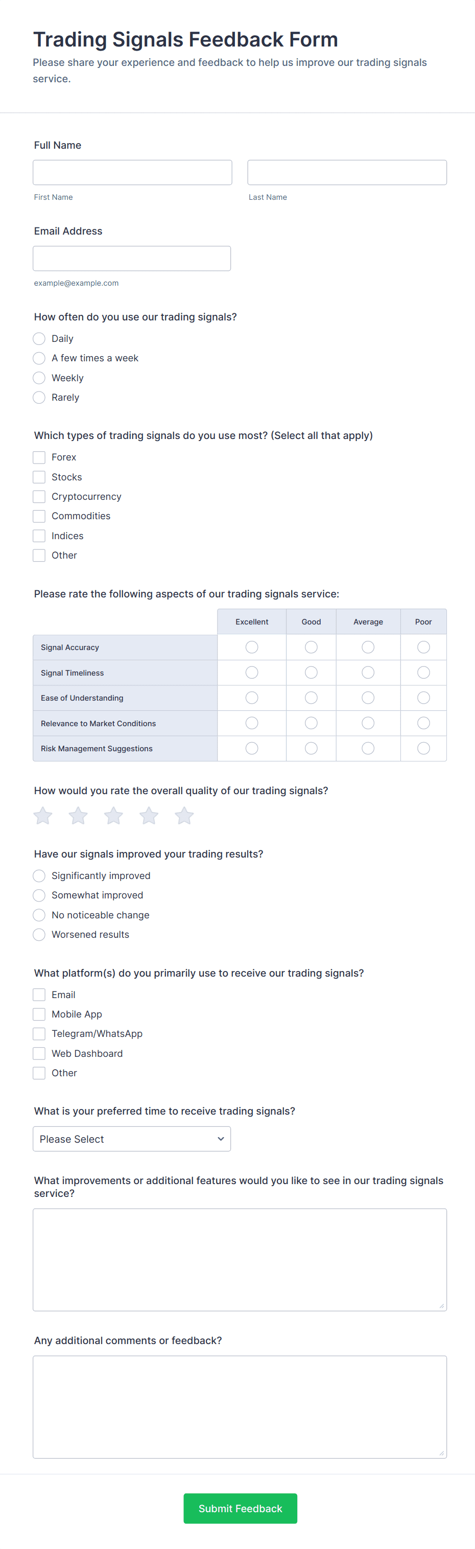 • Product feedback forms may include questions about usability, features, and likelihood to recommend.