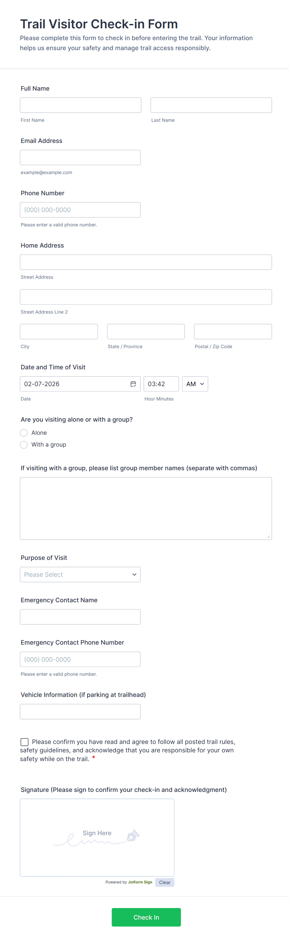 Check-In Form Templates are digital forms designed to streamline the process of recording arrivals and departures for a variety of settings, such as events, appointments, workplaces, schools, hotels, and healthcare facilities. These templates help organizations efficiently track attendance, monitor visitor flow, and collect essential information from guests, employees, or participants. Whether you’re managing a conference, coordinating patient visits, or overseeing daily employee attendance, check-in forms provide a structured and professional way to gather and organize data, ensuring a smooth and secure check-in experience for everyone involved.
