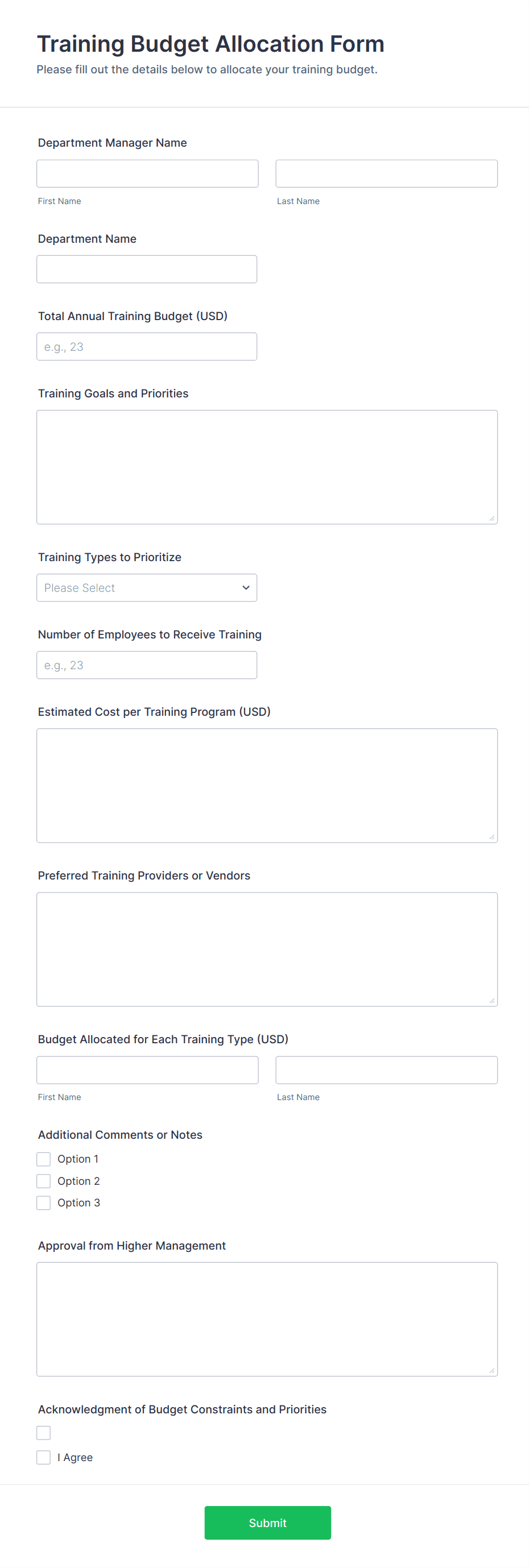 Training forms are specialized digital documents designed to streamline the process of organizing, managing, and evaluating training programs. These forms can be used for a variety of purposes, such as employee onboarding, skills assessments, training feedback, course registrations, pre-training surveys, and post-training evaluations. Organizations of all sizes — from corporate HR departments to educational institutions and training consultants — rely on training forms to collect essential information, track participant progress, and ensure that learning objectives are met efficiently.