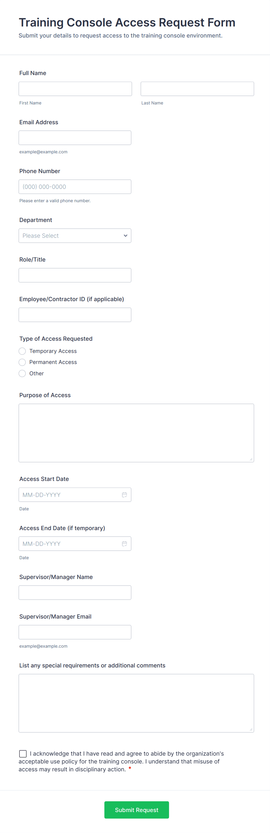 Collect requester name, department, contact info, and access type (physical, system, visitor). Include the reason for access and requested dates.