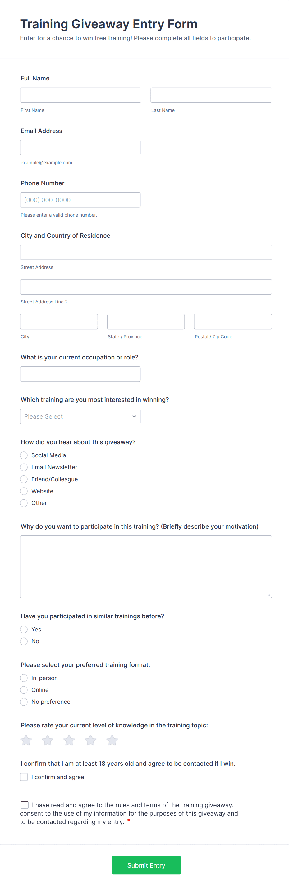 Giveaway forms are specialized online forms designed to facilitate the organization and management of contests, sweepstakes, raffles, and promotional giveaways. These forms are used to collect participant information, ensure fair entry processes, and streamline the selection of winners. Businesses, nonprofits, influencers, and event organizers often use giveaway forms to boost engagement, grow their audience, collect leads, or promote products and services. Typical use cases include social media contests, product launches, event promotions, charity raffles, and customer appreciation campaigns.
