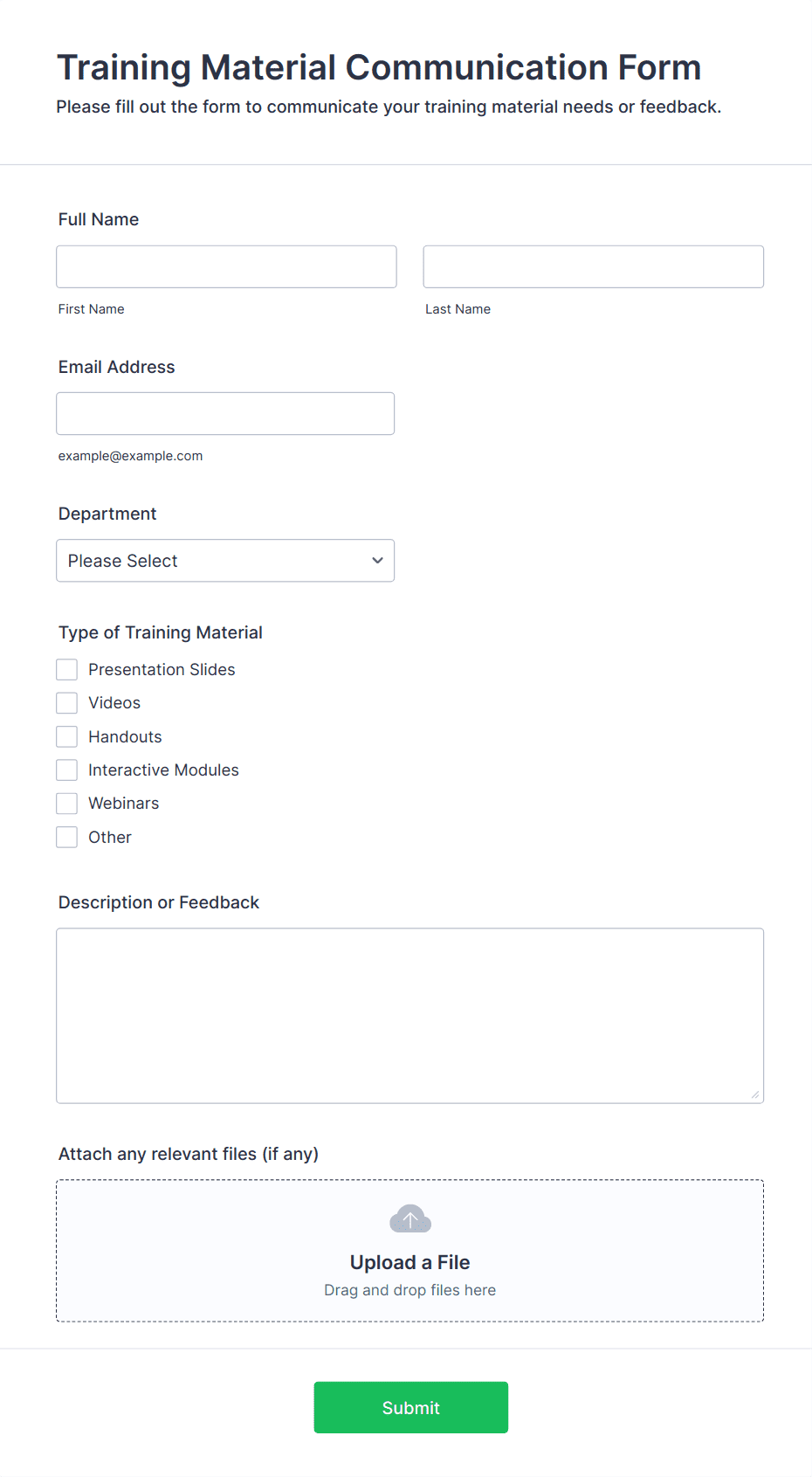 In summary, training forms can be tailored to fit a wide range of training-related tasks, with content and fields varying based on the specific use case and organizational needs.