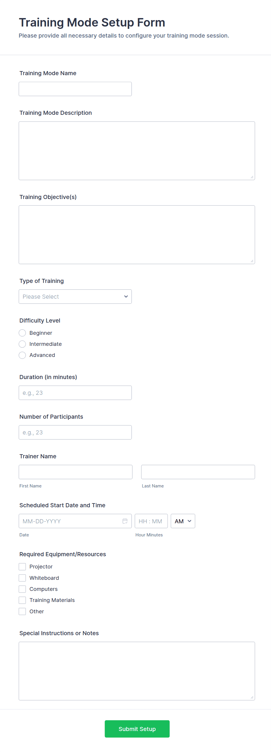 Training forms are specialized digital documents designed to streamline the process of organizing, managing, and evaluating training programs. These forms can be used for a variety of purposes, such as employee onboarding, skills assessments, training feedback, course registrations, pre-training surveys, and post-training evaluations. Organizations of all sizes — from corporate HR departments to educational institutions and training consultants — rely on training forms to collect essential information, track participant progress, and ensure that learning objectives are met efficiently.