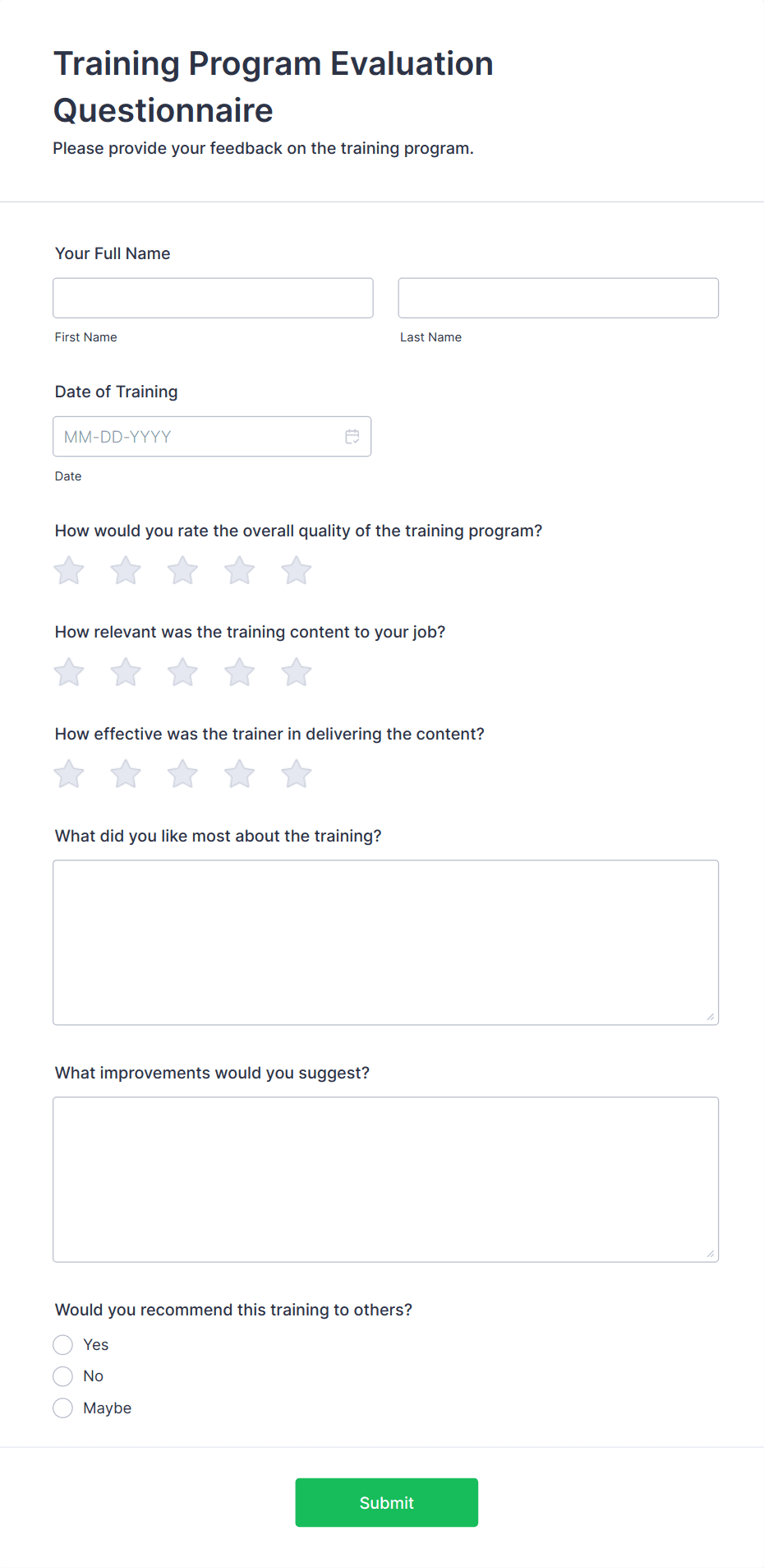 An evaluation survey form is a form template designed to collect information from students about their experience at the school, the quality of the education, and any suggestions for improvement.