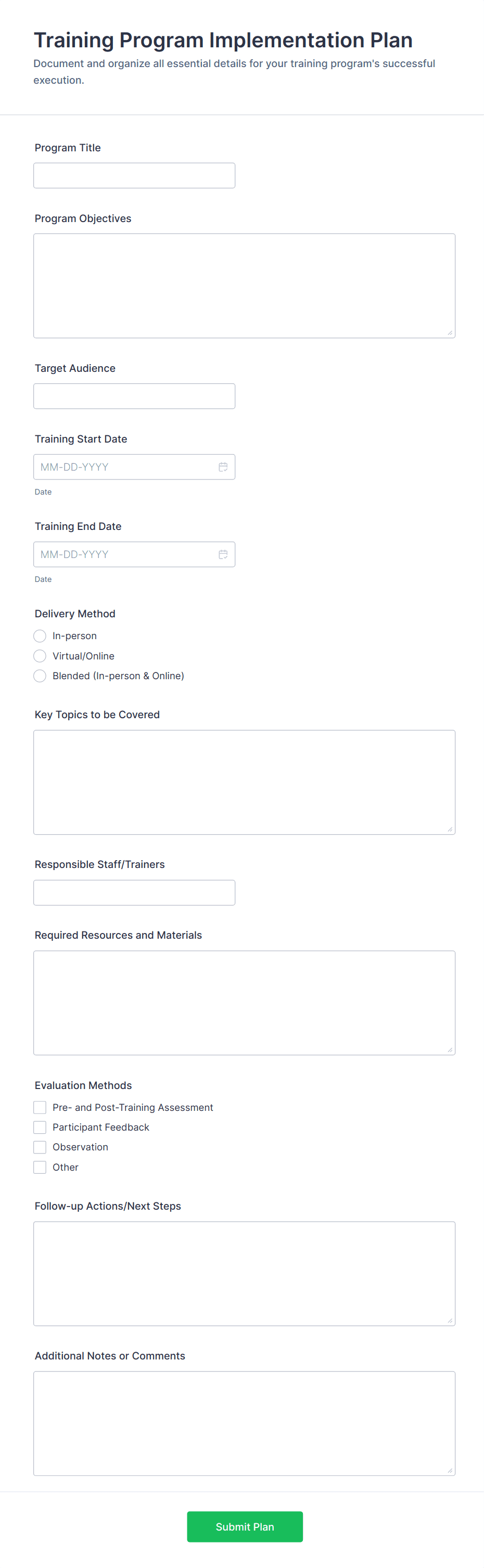 Training forms are specialized digital documents designed to streamline the process of organizing, managing, and evaluating training programs. These forms can be used for a variety of purposes, such as employee onboarding, skills assessments, training feedback, course registrations, pre-training surveys, and post-training evaluations. Organizations of all sizes — from corporate HR departments to educational institutions and training consultants — rely on training forms to collect essential information, track participant progress, and ensure that learning objectives are met efficiently.