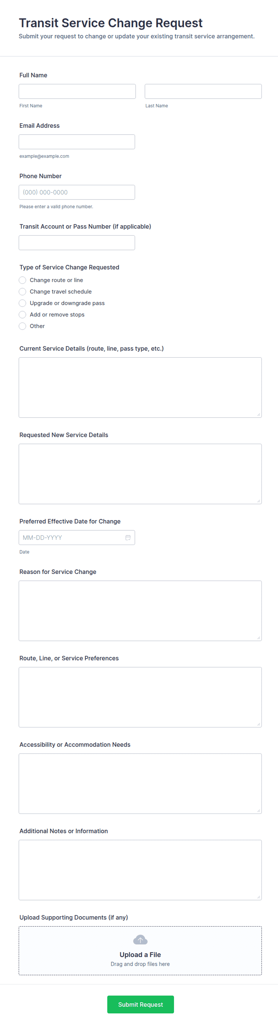 A Transportation Request Form is a digital document used to collect and manage requests for transportation services, such as vehicle bookings, shuttle arrangements, or delivery scheduling.