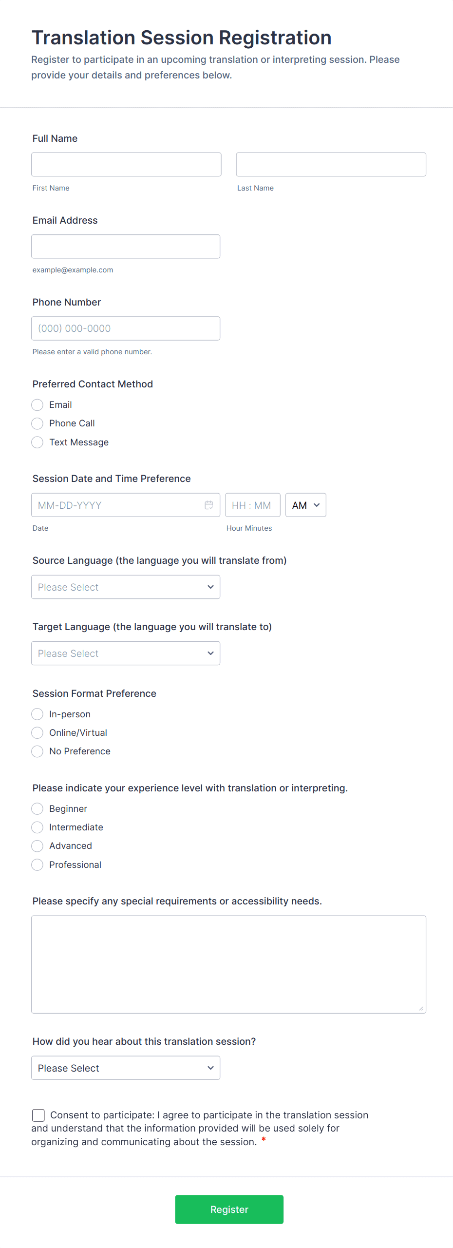 Typical fields include participant name, contact details, session selection, payment information, dietary or accessibility needs, and consent agreements.