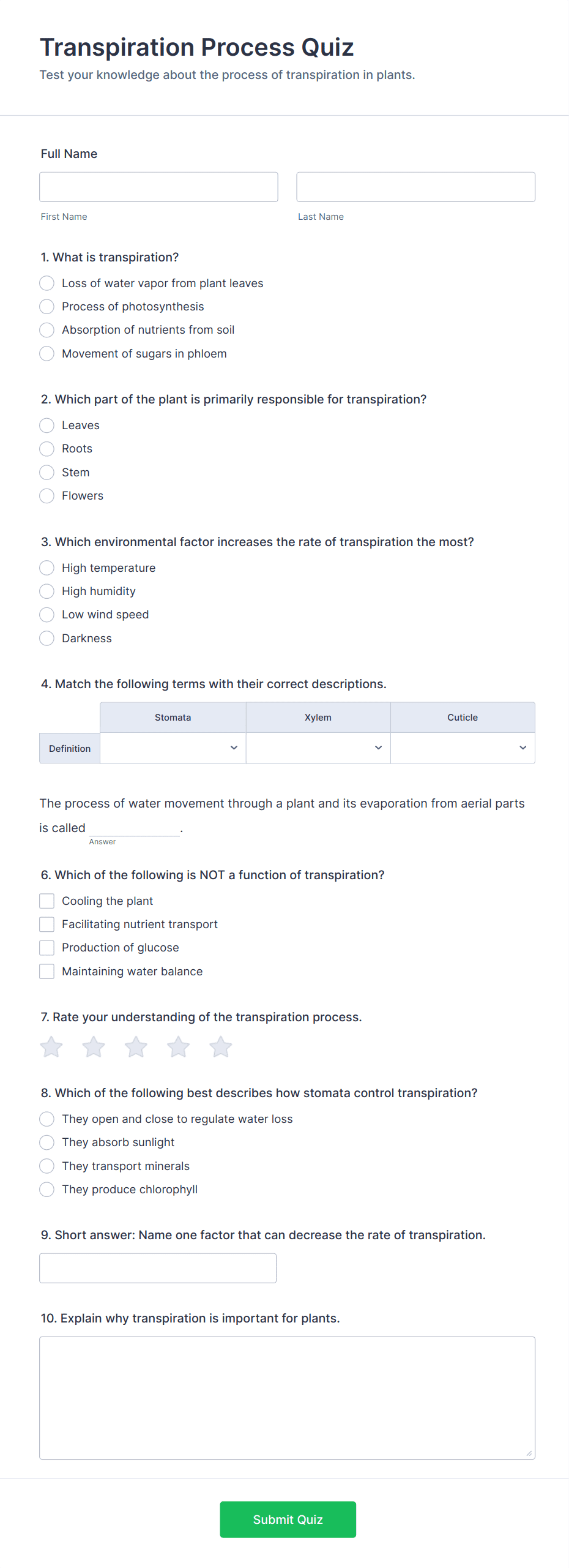 Quiz Templates are pre-designed forms specifically created to facilitate the process of building quizzes for a variety of purposes, such as education, employee training, lead generation, event engagement, and more. These templates provide a structured way to present questions, collect answers, and automatically score or evaluate responses. Whether you’re a teacher assessing student knowledge, a business running a product knowledge test, or a marketer creating a fun personality quiz, Quiz Templates offer a flexible foundation to suit your needs. They can be used for online exams, trivia games, onboarding assessments, customer feedback quizzes, and interactive learning modules.