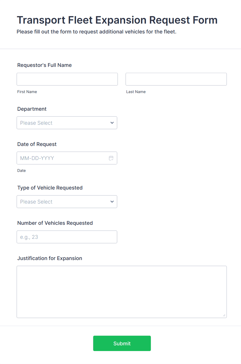 A Vehicle Requisition Form is a form template designed to facilitate the systematic and controlled process of requesting, approving, and assigning vehicles for business-related activities within an organization.