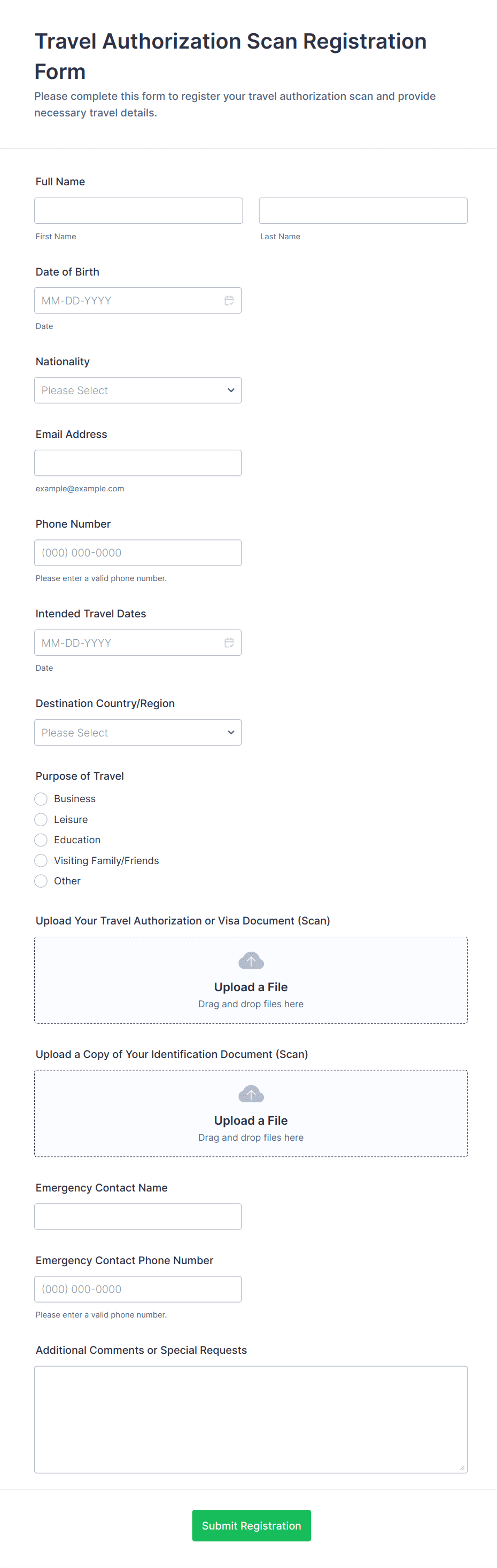 - Support Request Forms: Combine file upload with detailed problem description fields and contact information.