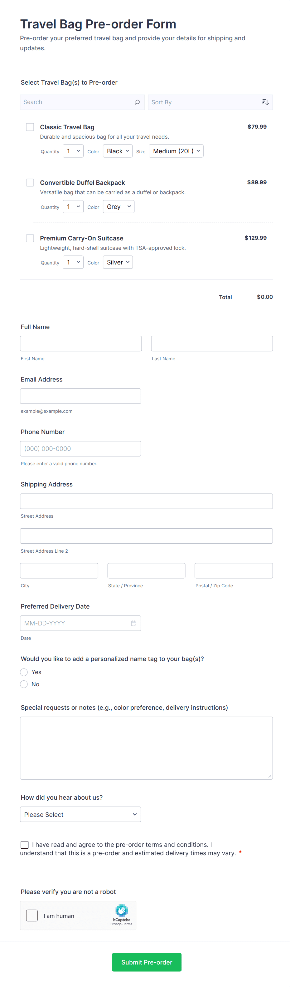Preorder forms are specialized online forms designed to collect advance orders for products or services before they are officially released or available for general sale. Businesses, creators, and organizations use preorder forms to gauge demand, secure early sales, and streamline inventory planning for upcoming launches. These forms are commonly used for new product releases, limited-edition items, event tickets, seasonal goods, or even digital content. By allowing customers to reserve or purchase items ahead of time, preorder forms help businesses manage expectations, reduce the risk of overproduction, and build excitement around new offerings.