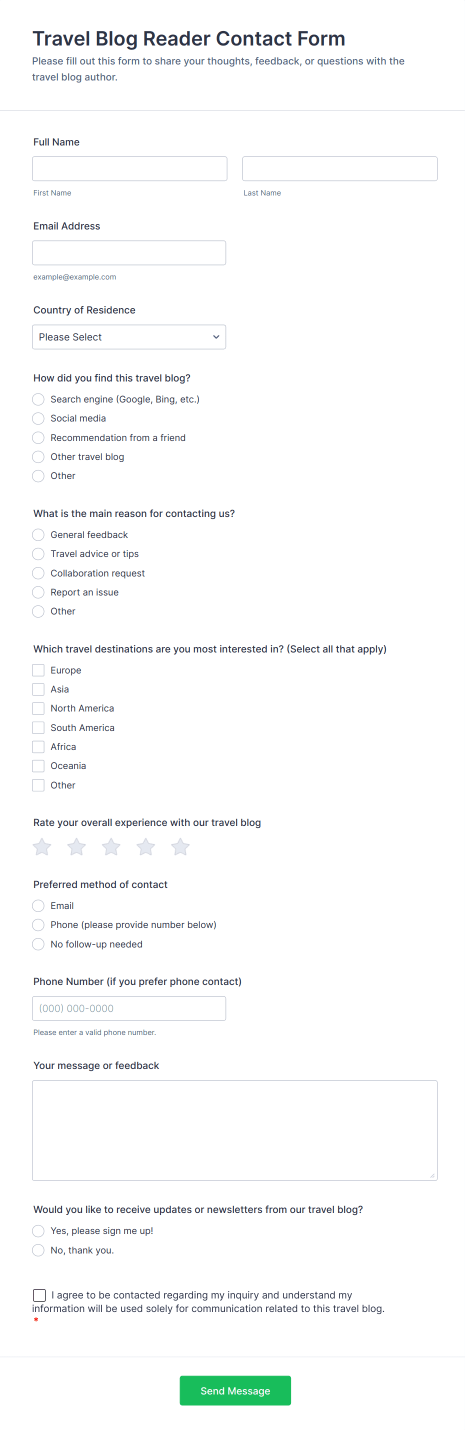 • For specialized use cases, include dropdowns (e.g., inquiry type), checkboxes (e.g., preferred contact method), or file upload fields (for attachments or screenshots).