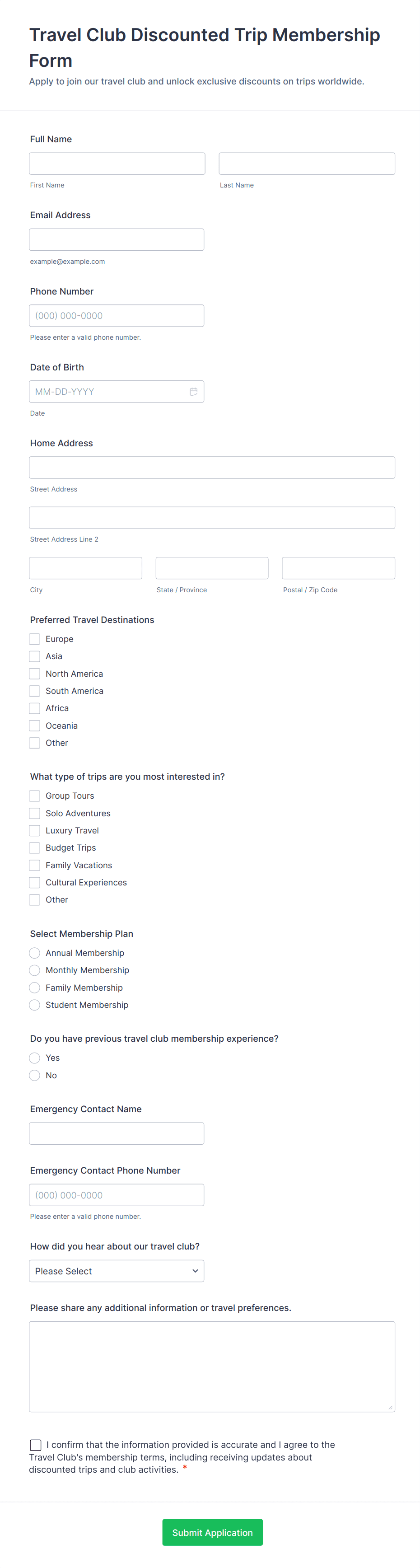 Membership Registration Forms are essential tools for organizations, clubs, associations, gyms, and other groups that require individuals to sign up and become members. These forms are designed to collect vital information from prospective members, such as contact details, membership preferences, payment information, and consent to terms and conditions. Whether you’re managing a professional association, a sports club, a nonprofit, or an online community, membership registration forms streamline the onboarding process, ensure accurate data collection, and help maintain organized member records. Use cases range from annual club sign-ups and event-based memberships to recurring subscription services and exclusive access programs.