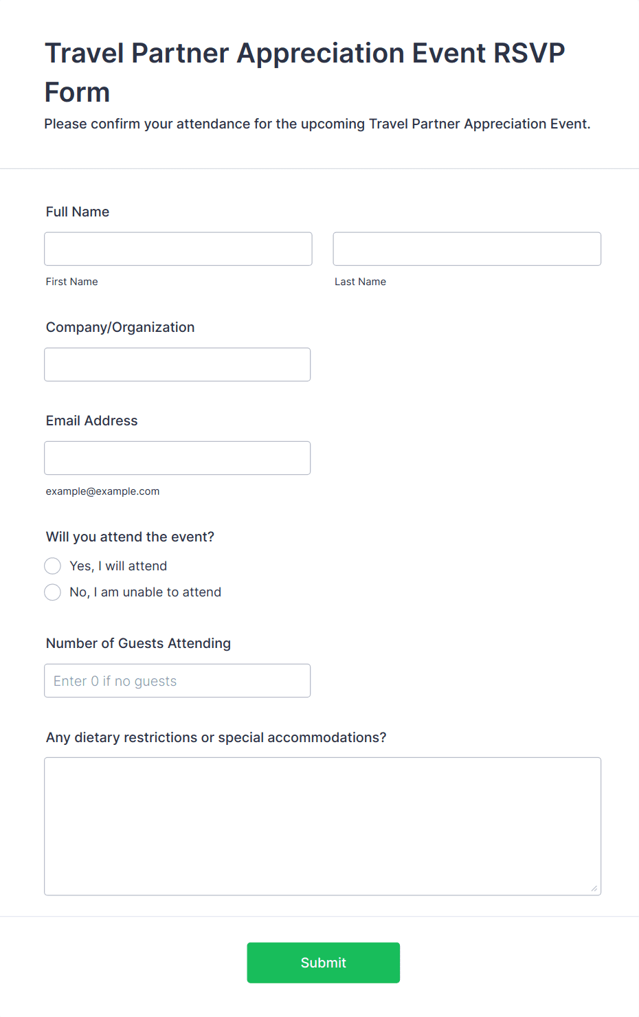 RSVP forms are digital tools designed to collect responses from invitees regarding their attendance at events, gatherings, meetings, or special occasions. Whether you’re organizing a wedding, corporate seminar, birthday party, or community event, RSVP forms streamline the process of confirming guest participation, gathering essential details like meal preferences, plus-ones, or special requirements. These forms help event organizers efficiently manage headcounts, plan logistics, and ensure a smooth experience for both hosts and attendees. The versatility of RSVP forms means they can be tailored for formal galas, casual get-togethers, virtual webinars, or even recurring club meetings.