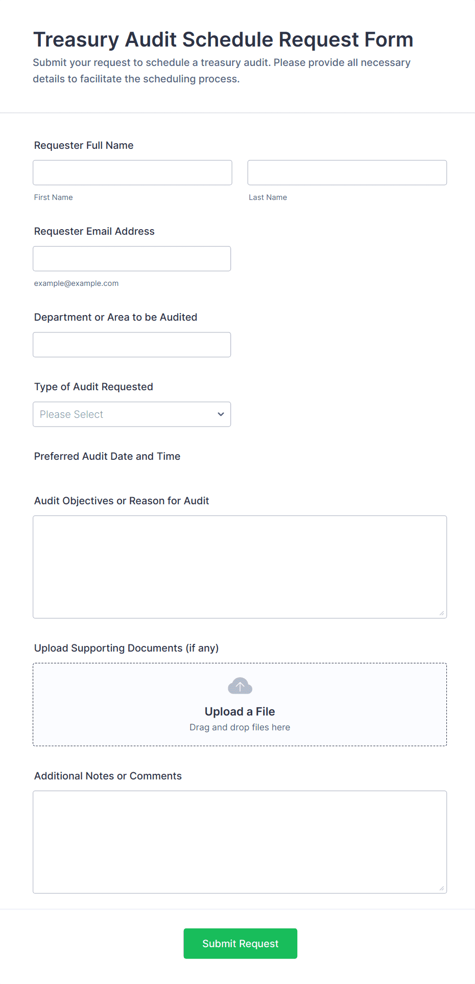 - Compliance Audits: Require fields for regulatory references, evidence collection, and sign-off sections.