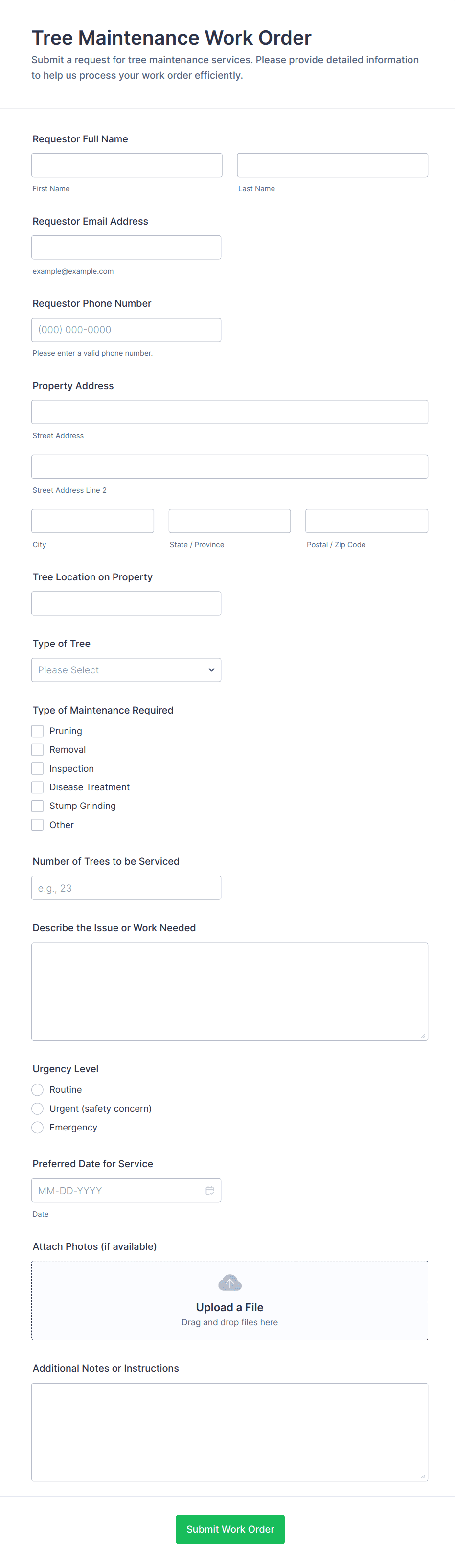 Receive work orders from contractors online. Easy-to-customize online form. Fill out and manage responses on any device. Embed in your website in seconds.