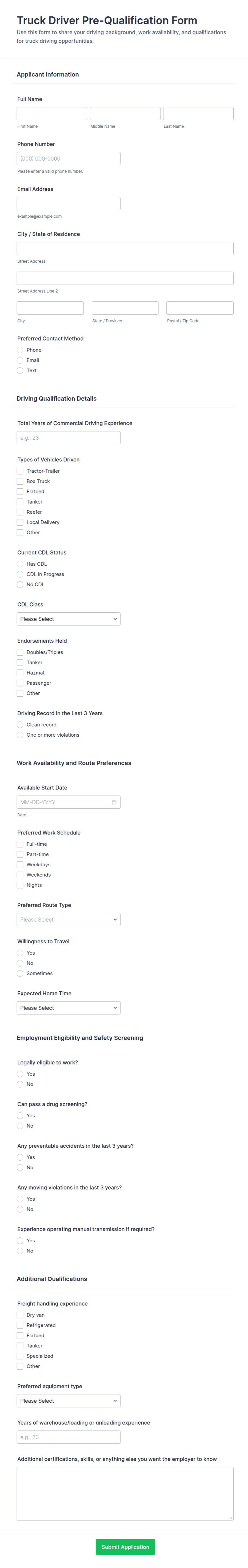 A truck driver job application form is used by trucking companies to collect basic application information from potential truck drivers. Start recruiting with a free online form today!