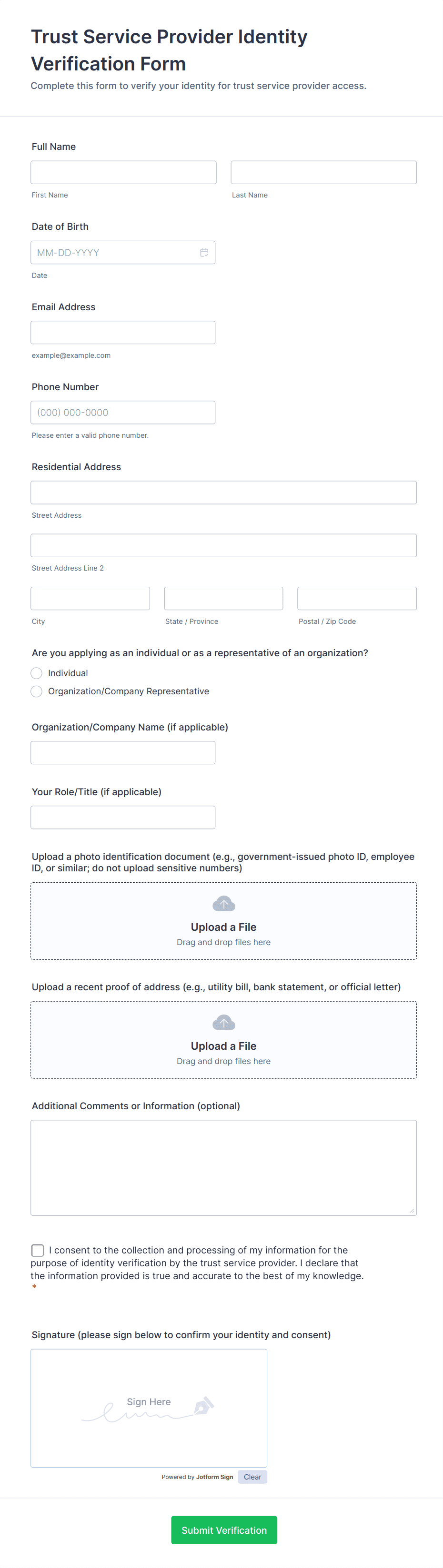 - For verification, include fields for uploading documents (e.g., ID, proof of address, certificates).
