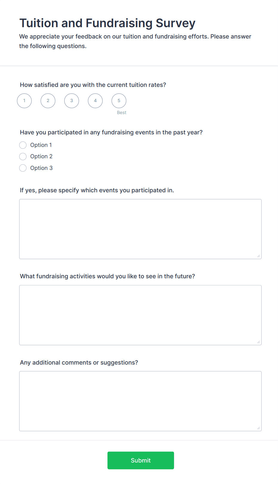 • Event Feedback Surveys: Evaluate attendee satisfaction and gather suggestions for future events.