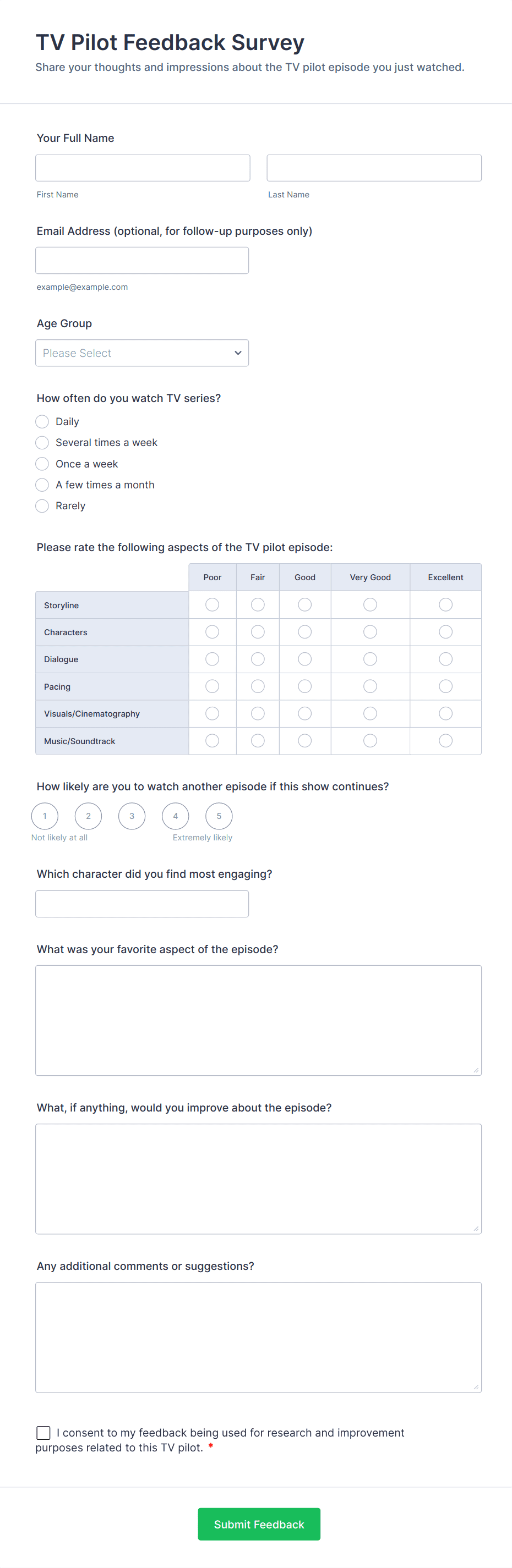 • For customer feedback, include questions about satisfaction, product quality, and likelihood to recommend.