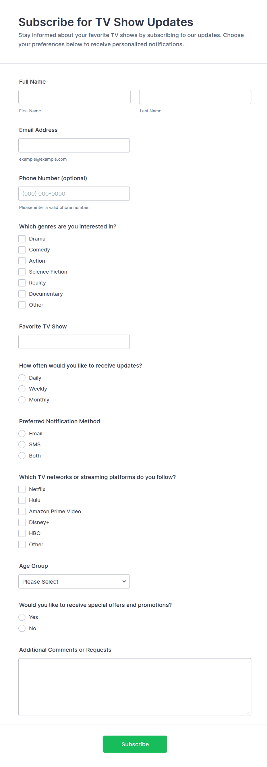 A subscription form is an online form used to collect information from individuals who wish to sign up for recurring services, communications, or memberships, such as newsletters, product deliveries, or club memberships.