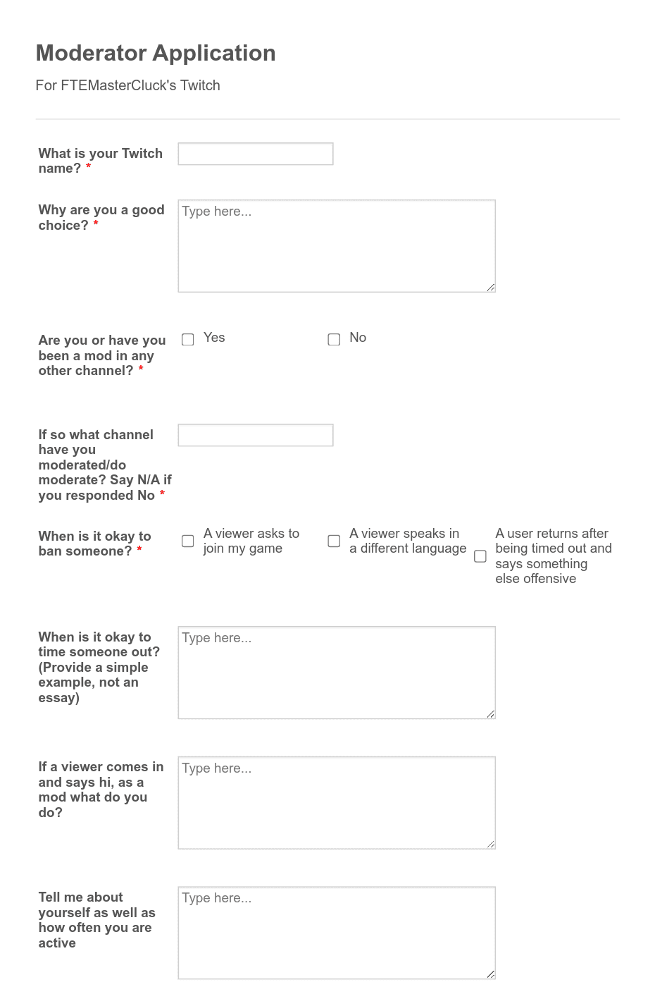 A Discord staff application form is used by a Discord server to recruit potential new staff members.