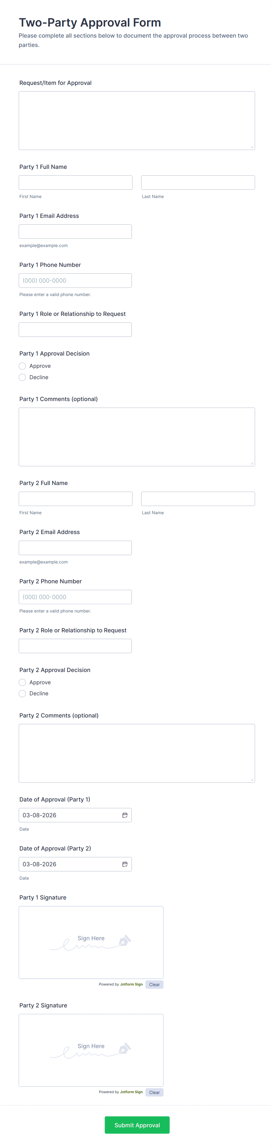 Approval Form Templates are specialized online forms designed to streamline and automate the process of requesting, reviewing, and granting approvals for a wide range of business and organizational needs. These templates are commonly used for leave requests, purchase orders, expense reimbursements, project proposals, document sign-offs, and more. By providing a structured workflow, approval forms ensure that requests are routed to the appropriate decision-makers, tracked efficiently, and documented for compliance and transparency. Whether you’re managing internal HR processes, procurement, or project management, approval forms help standardize and accelerate decision-making.