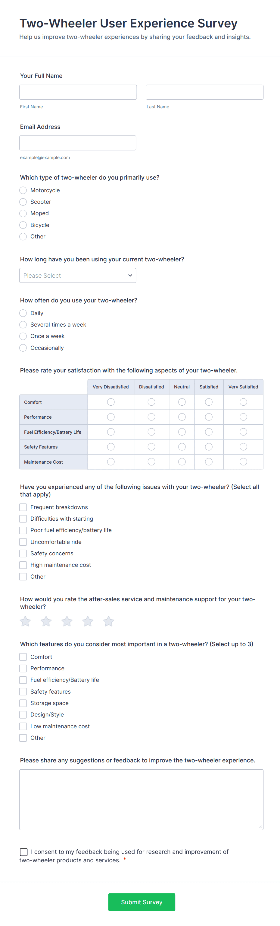 A survey for electric vehicle owners is a customer feedback survey that allows EV drivers to review their experience with their vehicle. Customize this template without coding!