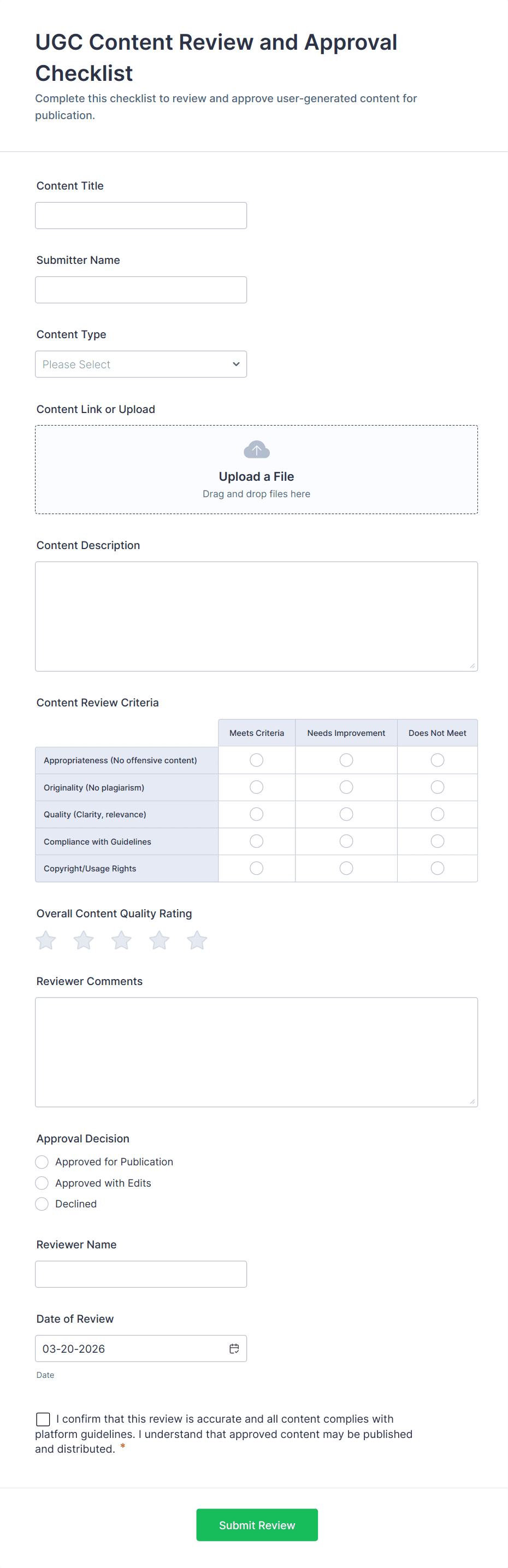 With Jotform, creating and managing checklist forms becomes effortless and highly customizable. Jotform’s intuitive drag-and-drop Form Builder allows users to design checklists tailored to their specific needs—no coding required. Users can add checkboxes, dropdowns, file uploads, and even integrate with other tools to automate data collection and reporting. Submissions are automatically stored in Jotform Tables, making it easy to track completion, analyze trends, and share results with team members. Whether you’re managing a personal project or coordinating a large team, Jotform’s checklist forms help you stay organized and efficient.