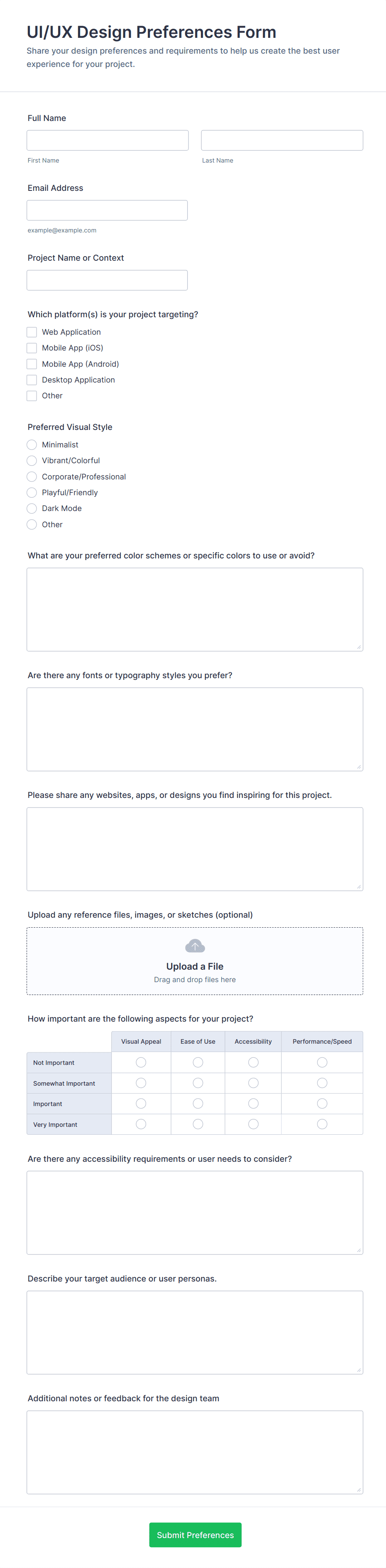 Typical fields include client contact details, project goals, design preferences, content requirements, budget, timeline, and any specific technical needs.