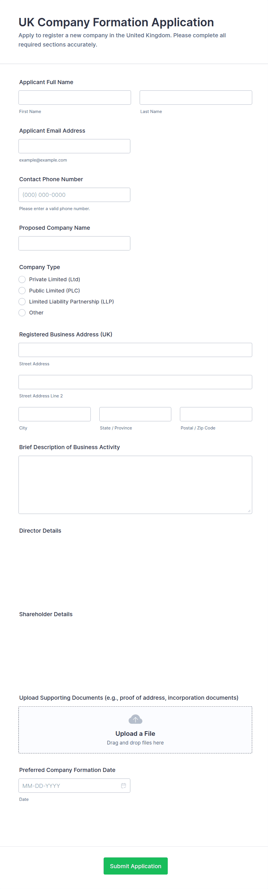 - Upload fields for supporting documents (e.g., articles of incorporation, licenses)