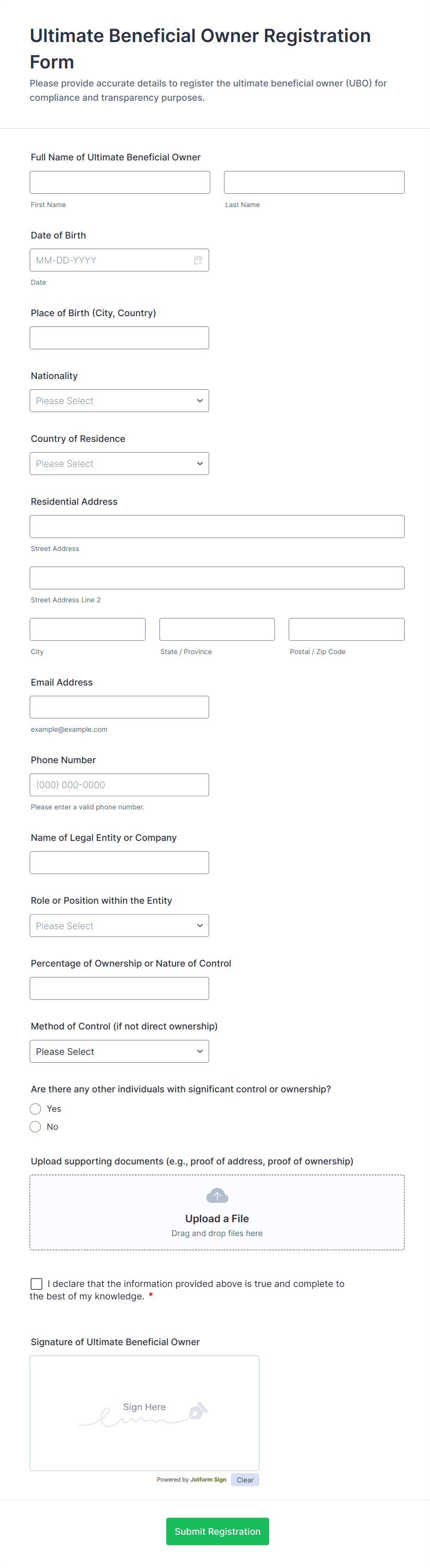- Government Registration: Forms may require detailed legal documentation uploads, tax ID fields, and compliance checklists.