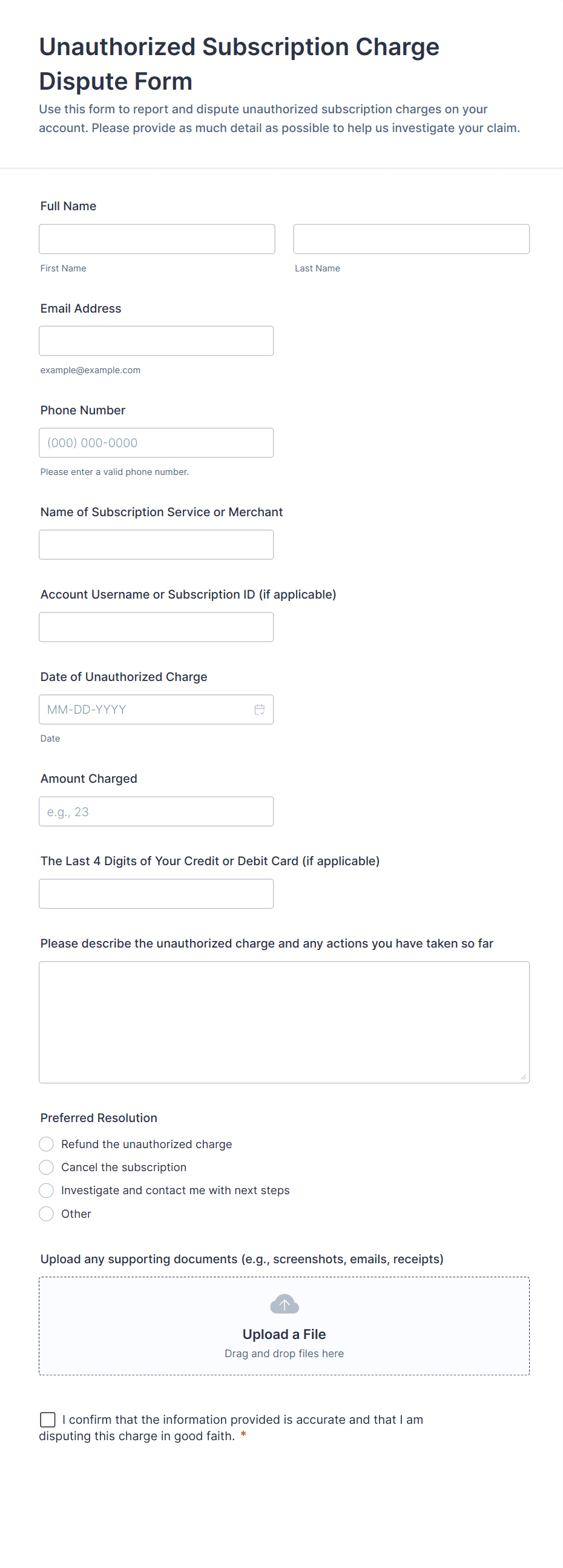 - File upload fields for supporting documents (receipts, photos, reports)