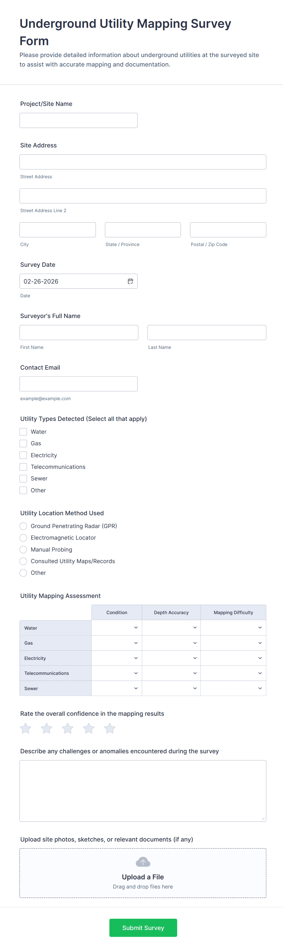 Surveyor forms are used by land surveyors, civil engineers, construction managers, environmental consultants, real estate professionals, and utility companies for a range of data collection and reporting needs.