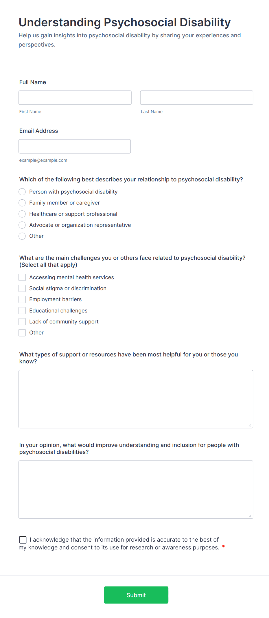 - Research Questionnaires: Require consent forms, demographic data, and study-specific queries.