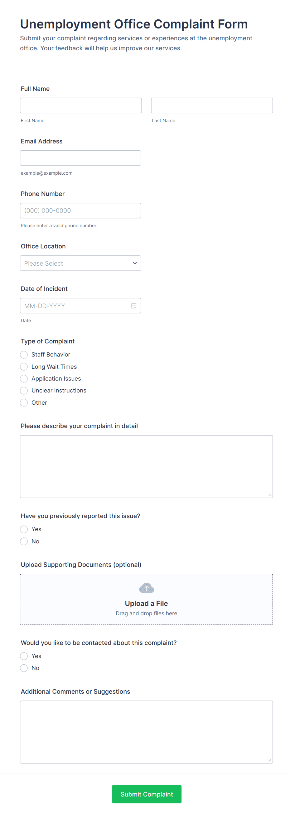 • Conditional Logic: Certain fields may appear only if specific options are selected (e.g., type of complaint).