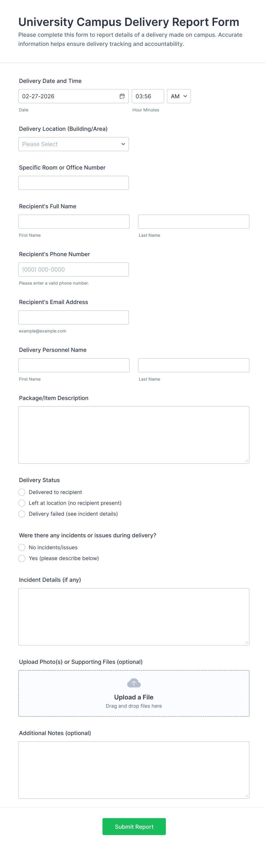 • Specialized Fields: File uploads (for receipts or photos), number fields (for quantities or amounts), and signature fields (for approvals).