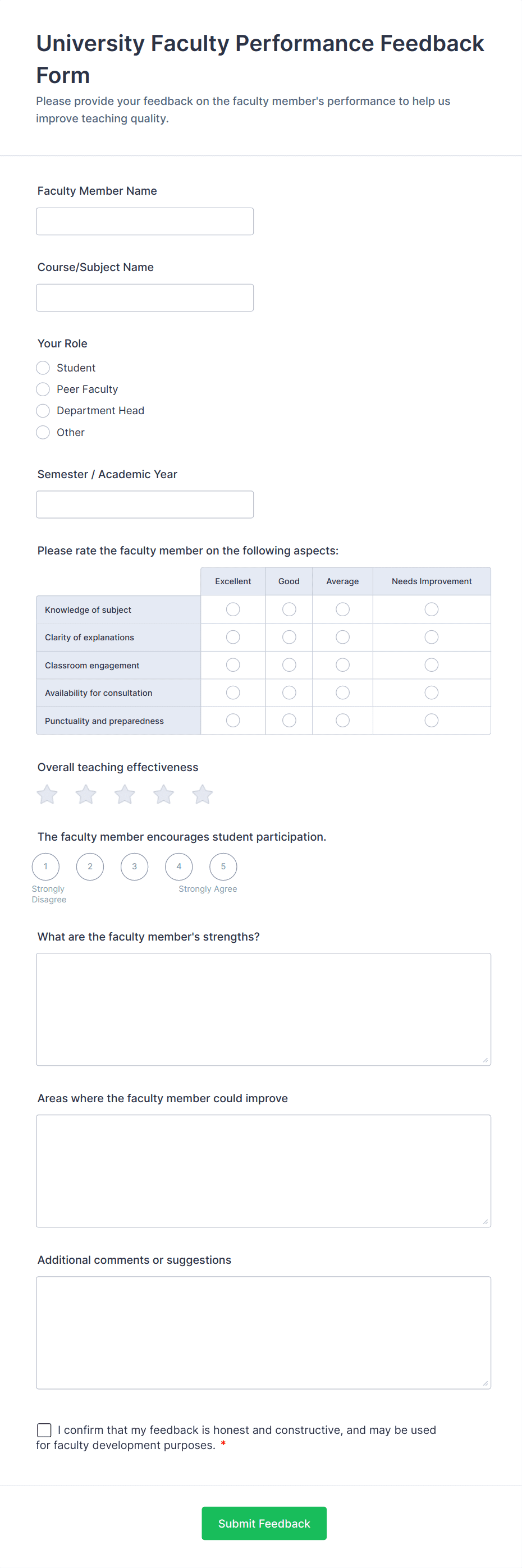 - Rating Scales: Likert scales or star ratings for aspects like subject knowledge, communication, classroom management, and engagement.
