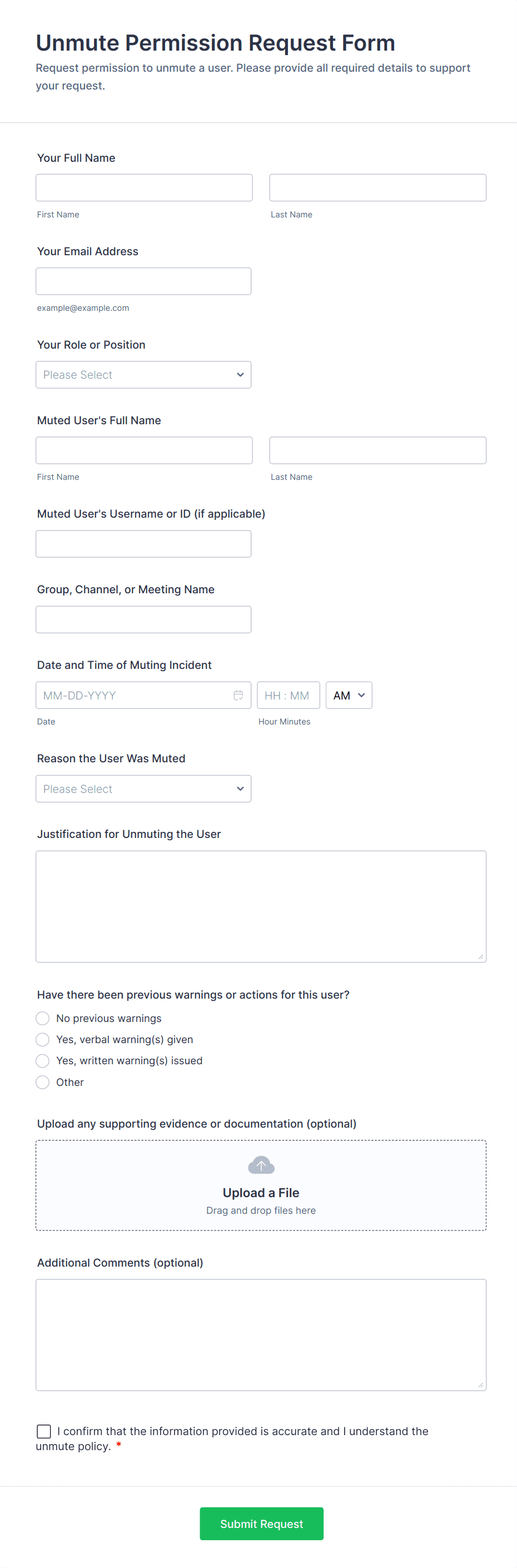 Access control forms are structured documents used to request, approve, and document access to physical locations, systems, or restricted resources. They help organizations manage who can enter certain areas, use specific equipment, or access sensitive digital systems by collecting consistent details such as requester identity, access level, justification, and approval records. Access control forms are commonly used in offices, campuses, data centers, hospitals, warehouses, and IT environments for badge requests, visitor access, temporary passes, role-based system access, and permission changes. By standardizing access requests, these forms reduce security risks, improve accountability, and create clear audit trails.