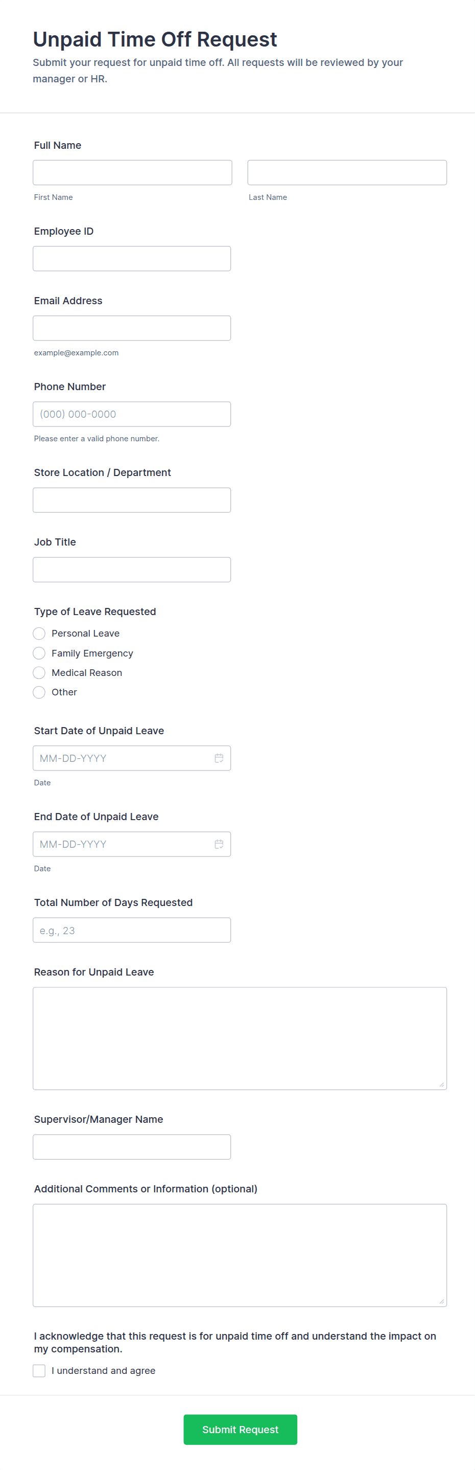 • Vacation Requests: May include fields for destination, emergency contact, and coverage plan.