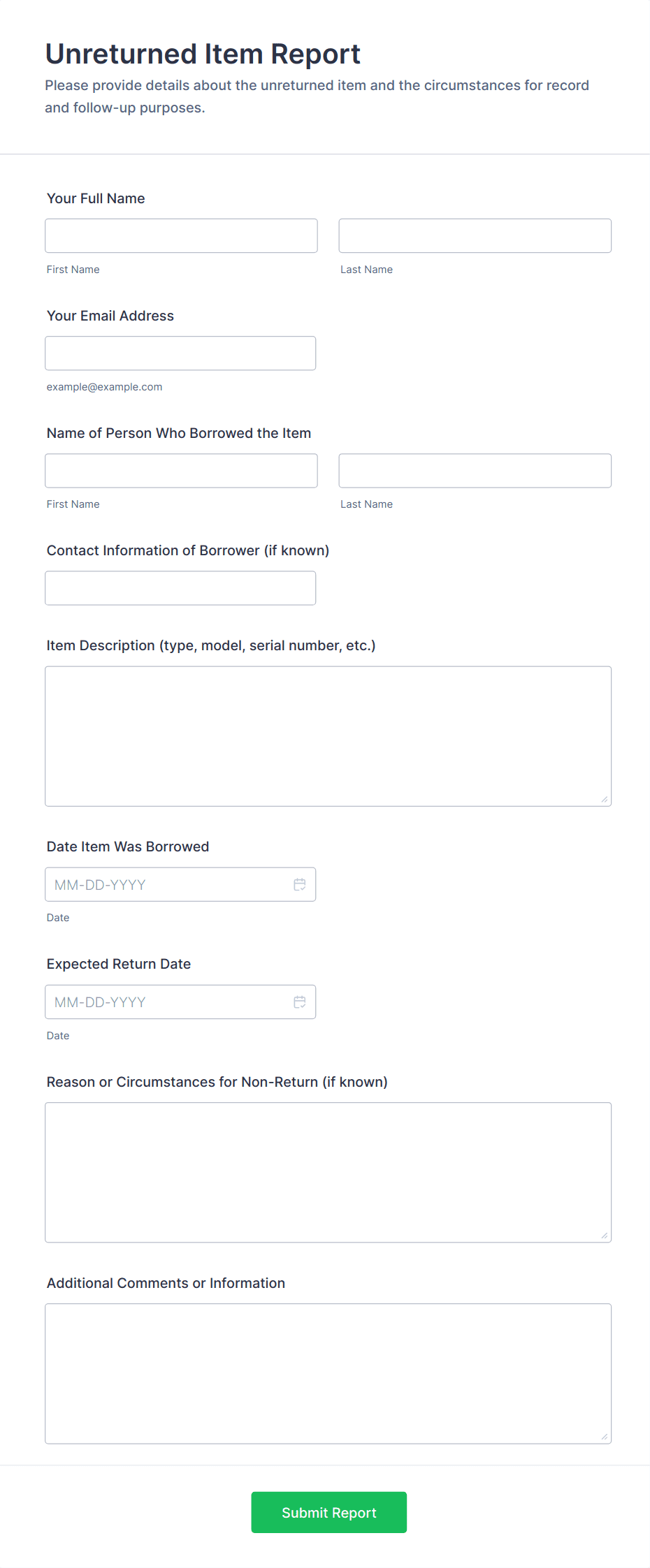 • For business reports: Include fields for dates, metrics, comments, and file uploads.