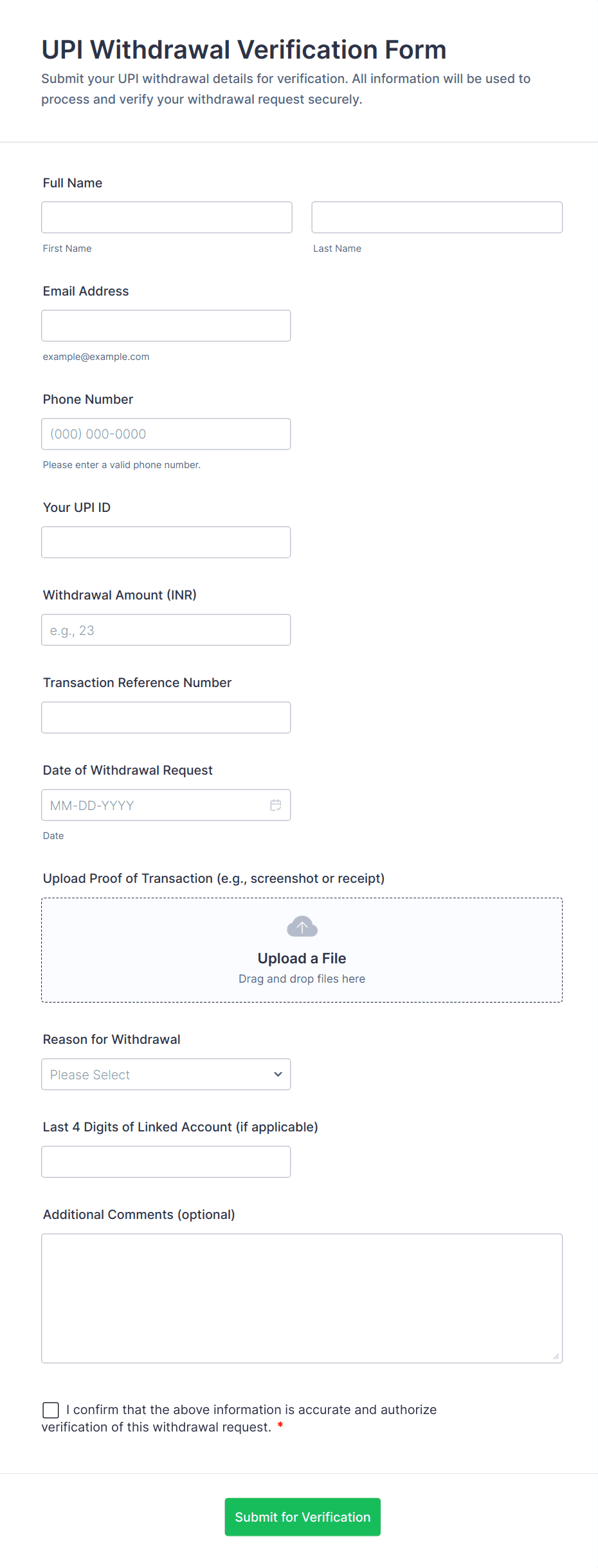 - For verification, include fields for uploading documents (e.g., ID, proof of address, certificates).