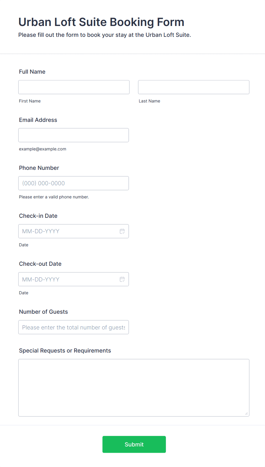 Booking forms are digital tools designed to streamline the process of scheduling appointments, reserving services, or booking resources. They are commonly used across a variety of industries, including hospitality, healthcare, education, event management, and personal services. Whether you’re managing hotel room reservations, client appointments, event registrations, or equipment rentals, booking forms help automate the intake of essential information, reduce manual errors, and ensure a smooth experience for both service providers and customers. Typical use cases include booking consultations, reserving meeting rooms, scheduling classes, or securing tickets for events.