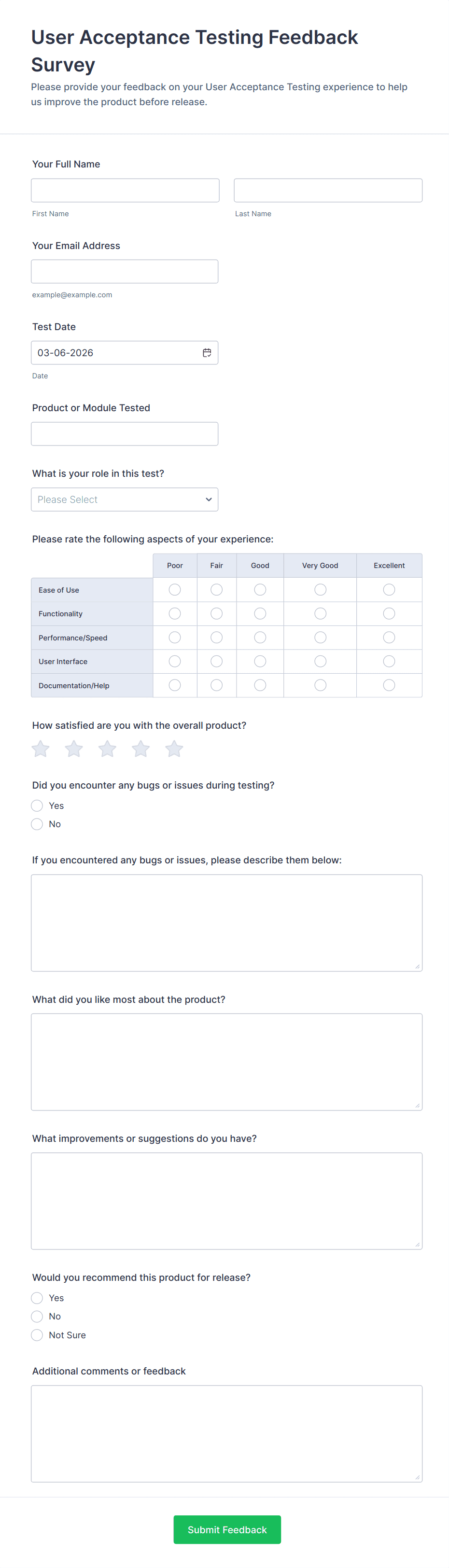 - Multiple choice or rating scale questions for satisfaction measurement.