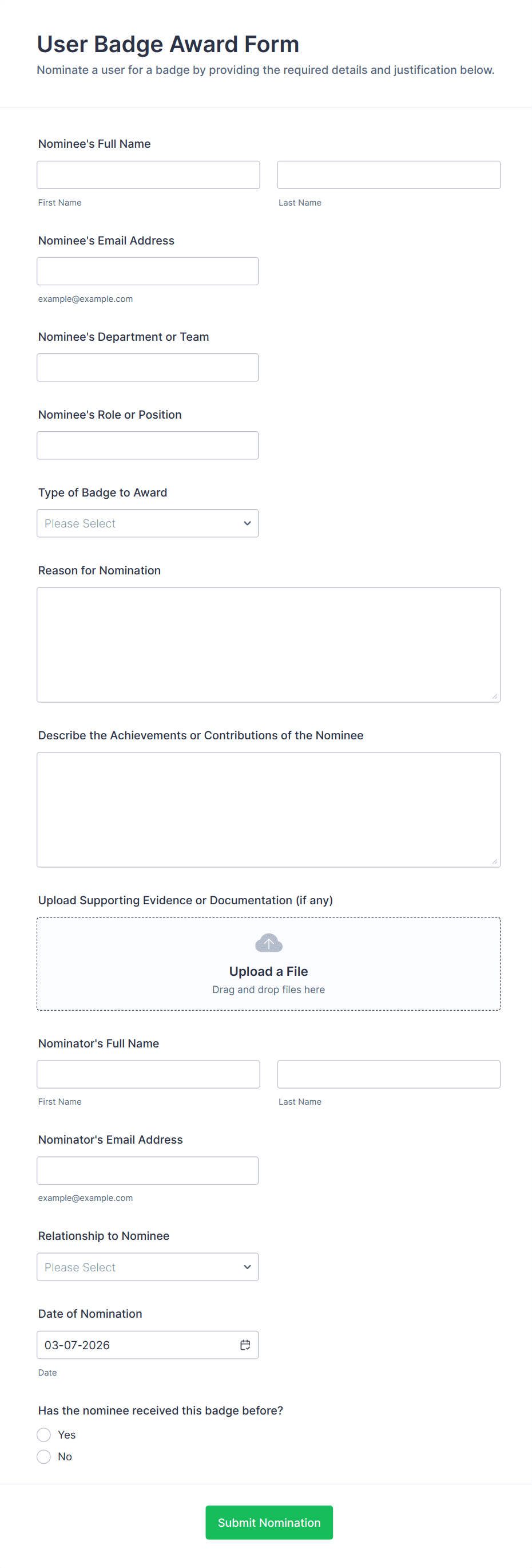 Award forms are used by HR departments, schools, non-profits, event organizers, professional associations, and anyone running a recognition or competition program.