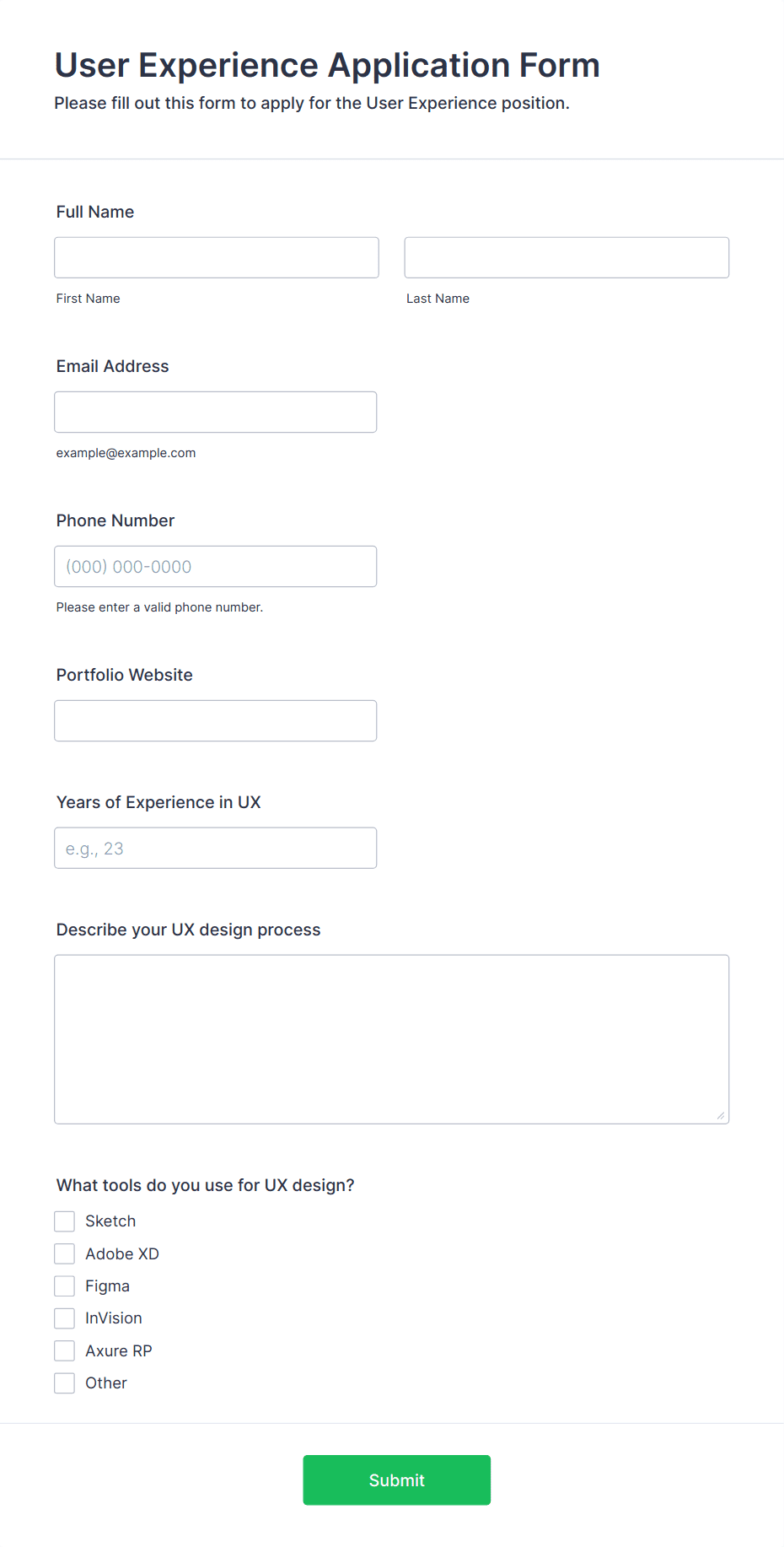 • For job applications, include fields for personal information, education, work experience, references, and file uploads for resumes or cover letters.