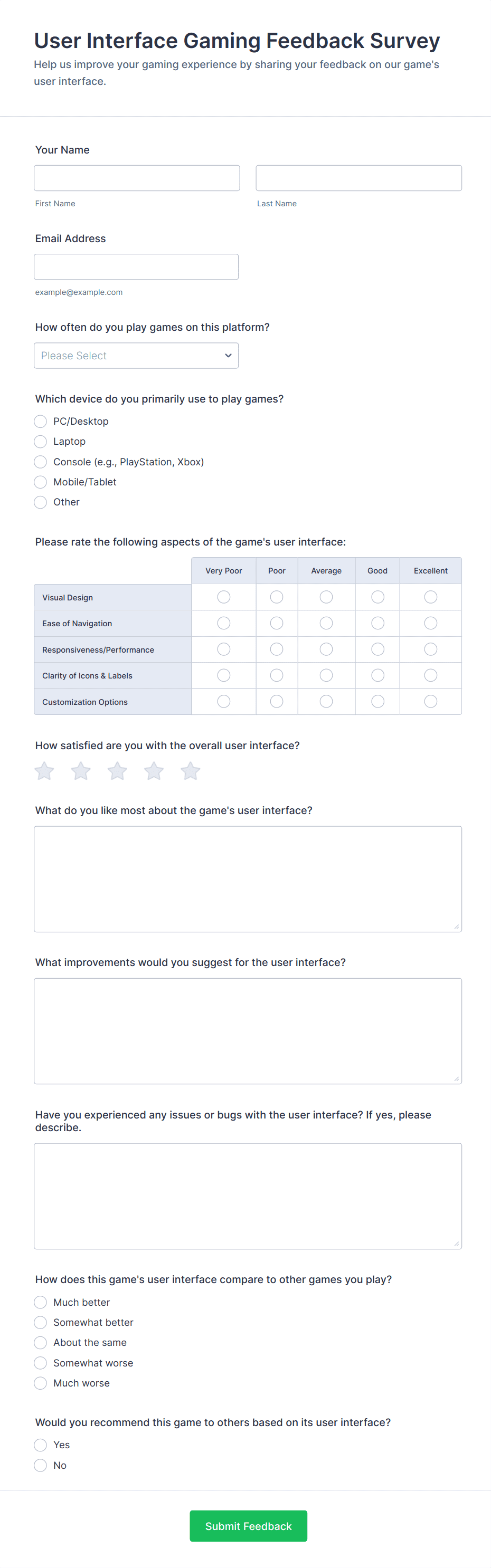 A Game Feedback Form is a form template designed to collect feedback from players and participants about a specific video game or tabletop game.